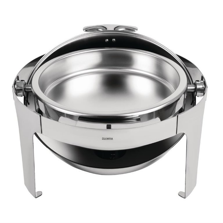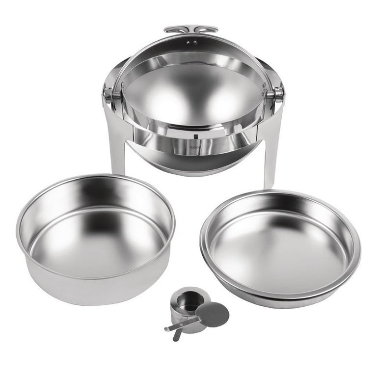 Chafing dish rond en acier inoxydable avec couvercle roll top. Fourni avec bac à eau, bac à aliment, couvercle et brûleur.