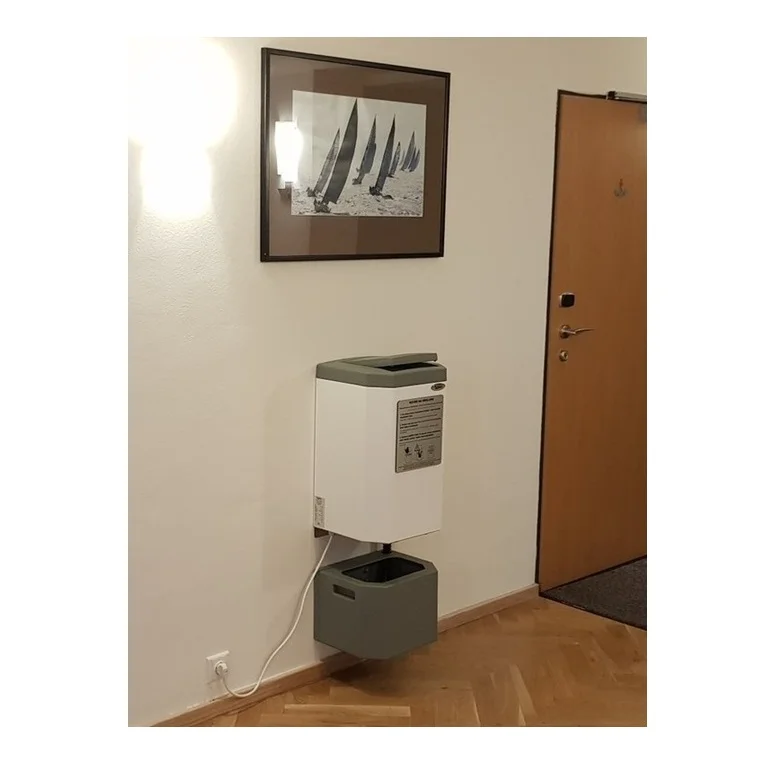 Nous vous proposons un réservoir d’eau d’une capacité de 18 litres en polyéthylène durable de haute qualité résistant aux produits chimiques à installé sur le mur juste en dessous du séchoir. Comme il a les mêmes dimensions et ressemble au séchoir, il crée un ensemble harmonieux.