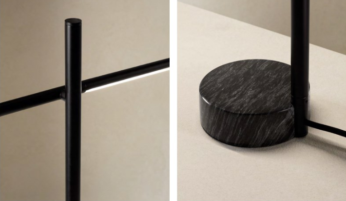 (H x P) : 610 x 605 mm. Rotation de la source lumineuse et de son axe. Variateur tactile. Pied en marbre noir.