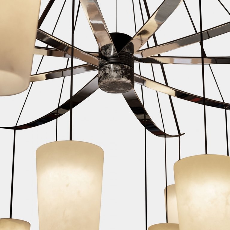 Lustre design (HxØ): 1216 x 1725mm. Tulipe (HxØ): 160 x 84mm. Contrepoids central en marbre noir