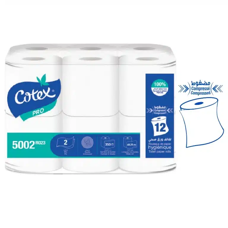 Le papier toilette gaufré 2 plis Cotex pro se rendra rapidement indispensable au sein de votre établissement.