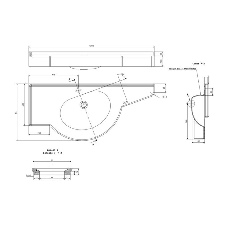 Lave mains d'angle PMR Ankara longueur 1091mm. Lavabo PMR avec pointe à droite ou à gauche.